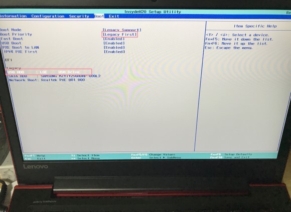 3. 해당 boot usb 를 설치하고자하는 노트북에 연결한뒤 전원을넣고 F12, F2 등 제조사마다 다르지만 바이오스 세팅화면으로 진입한다. 제 경우는 레노버 노트북이므로 F12 로 진입후 상단메뉴의 Boot>USB HDD 가 상단에 위치하도록 하였다