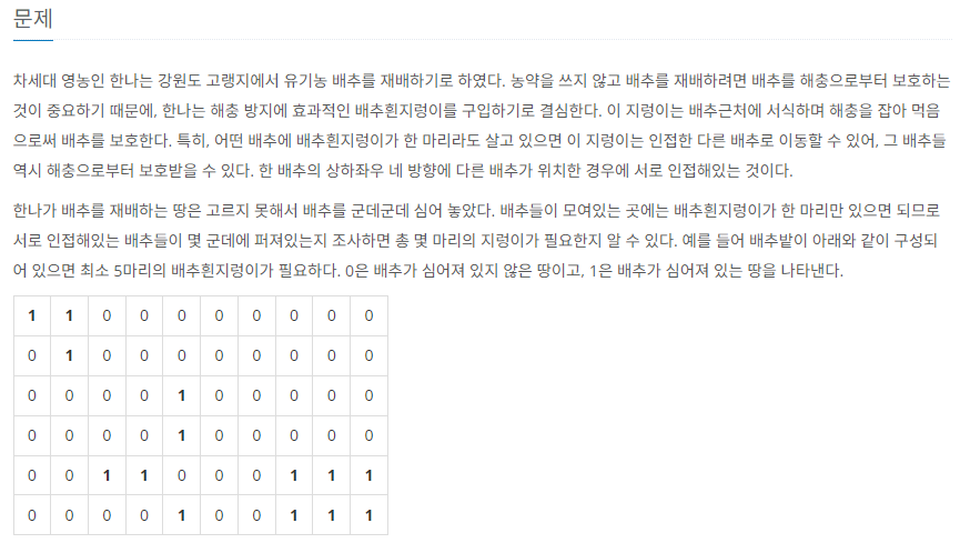한번의 탐색이 끝나면 count가 증가하고 탐색시에 visit배열로 방문 체크를하므로 다음 반복시 반복하지 않는 배열중 "1"인 값을찾아 해당 과정을 반복합니다.
